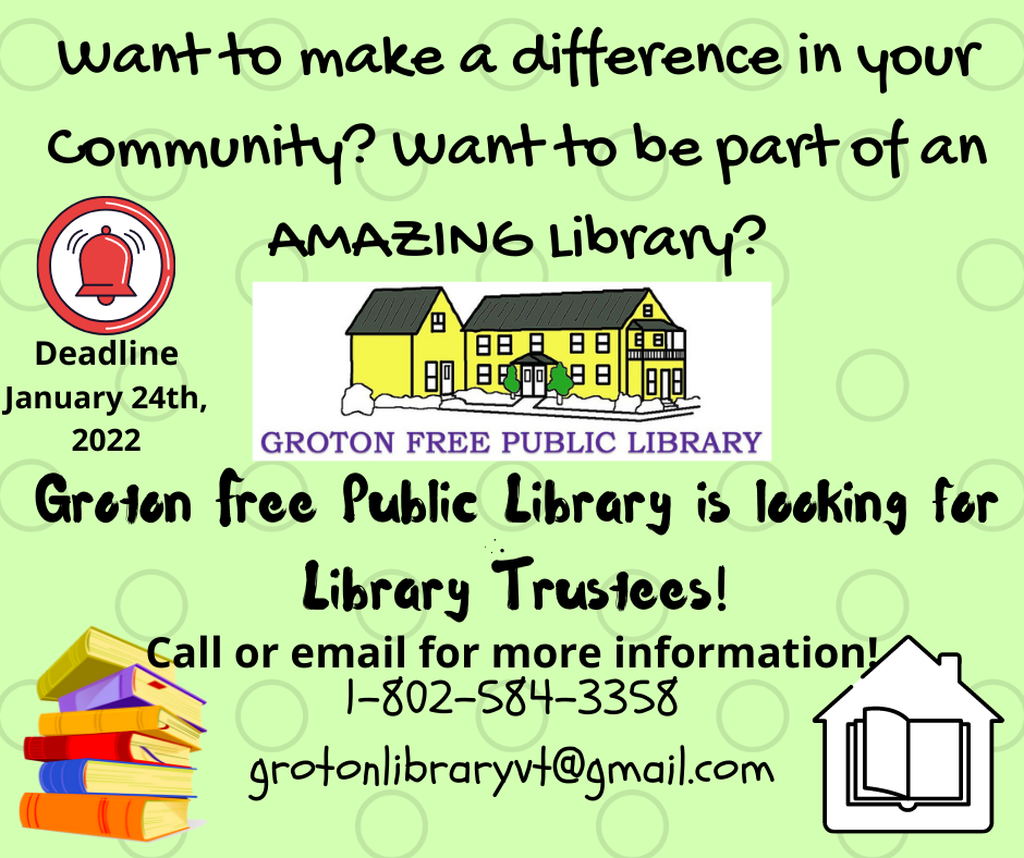 Town Meeting 2022: Will be held via Australian Ballot due to Covid 19. If you would like to be on the ballot for the Library Trustee position, please visit the Town of Groton website (www.grotonvt.com) and fill out a consent form and send to Town clerk by Jan. 24th, 2022